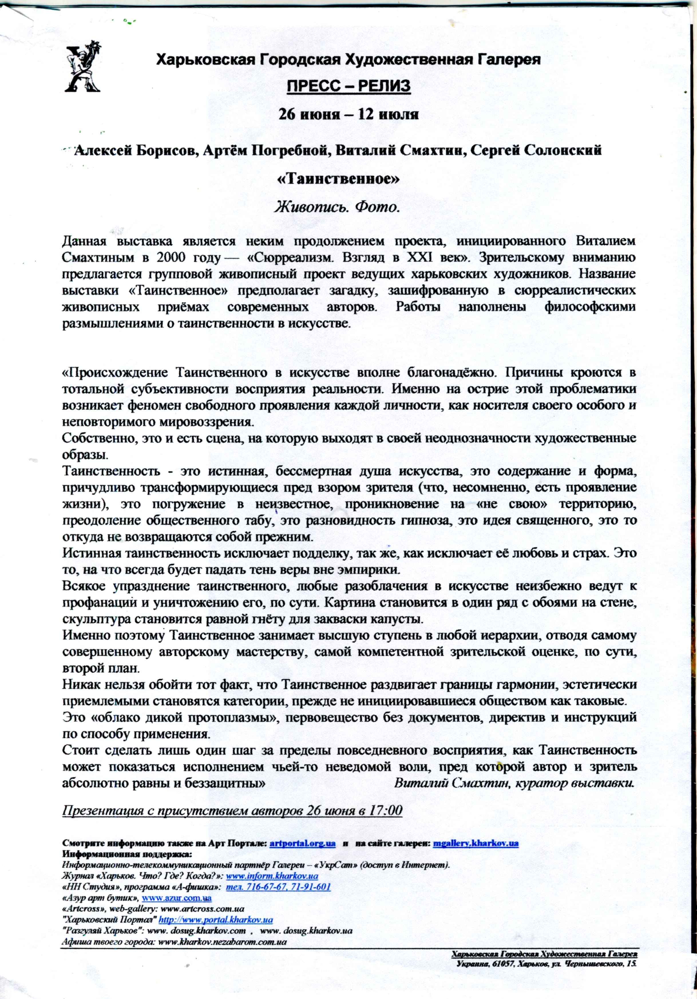 - Таинственное: Каталог выставки. А. Борисов, А. Погребной, В. Смахтин, С. Солонский. — Х. : Колорит, 2007. — 24 с.