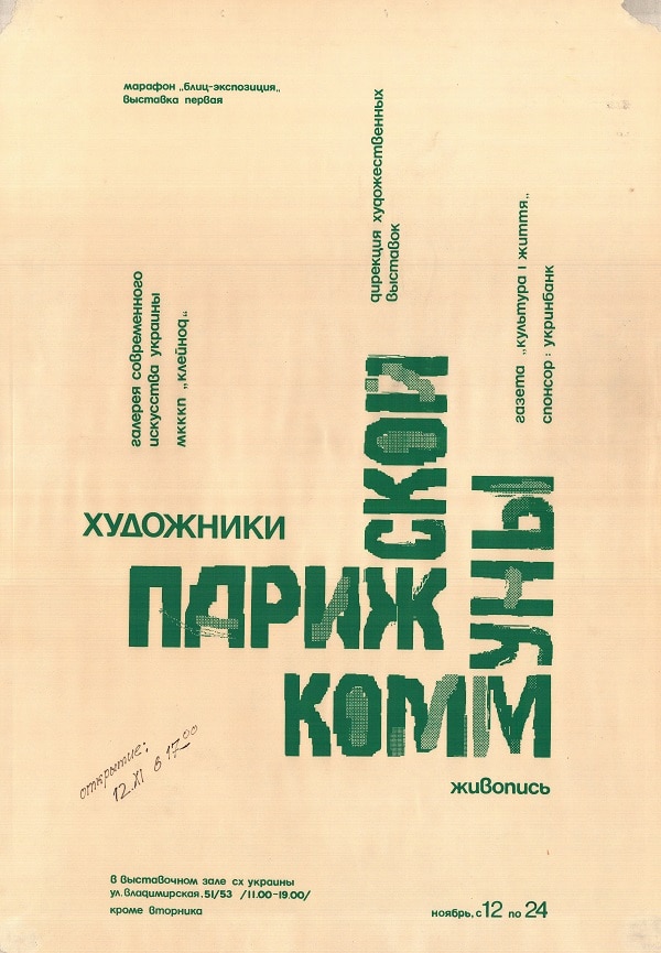 Виставка «Художники Паризької комуни» розпочала виставковий Марафон-бліц, заявлений Олександром Соловйовим та галереєю сучасного мистецтва України «УКV» наприкінці 1991 року. «На виставці експонувалися твори молодих київських художників, чиї майстерні розташовувалися в районі колишньої вулиці Паризької комуни, нині Михайлівської. Виставка включала в себе картини, пов’язані з ідеями трансавангарду, чий запізнілий сплеск в Україні, що припав на 1987-1990 рр, все ж породив досить своєрідний національно-регіональний феномен такого роду живопису; і картини, які свідчили про відхід від трансавангарду і появ інших якостей, зокрема і в чомусь близьких симпатічно-недбалу дивакуватість кьютізма, що поширюється сьогодні в мистецтві. […] Твори цих художників, підібрані і з урахуванням оформленої, так би мовити, недавньої трансавангардного історії, і з урахуванням ще тільки формується ситуації зміни естетичних орієнтацій.» [ref]з прес-релізу Галереї сучасного мистецтва України «УКV»[/ref].