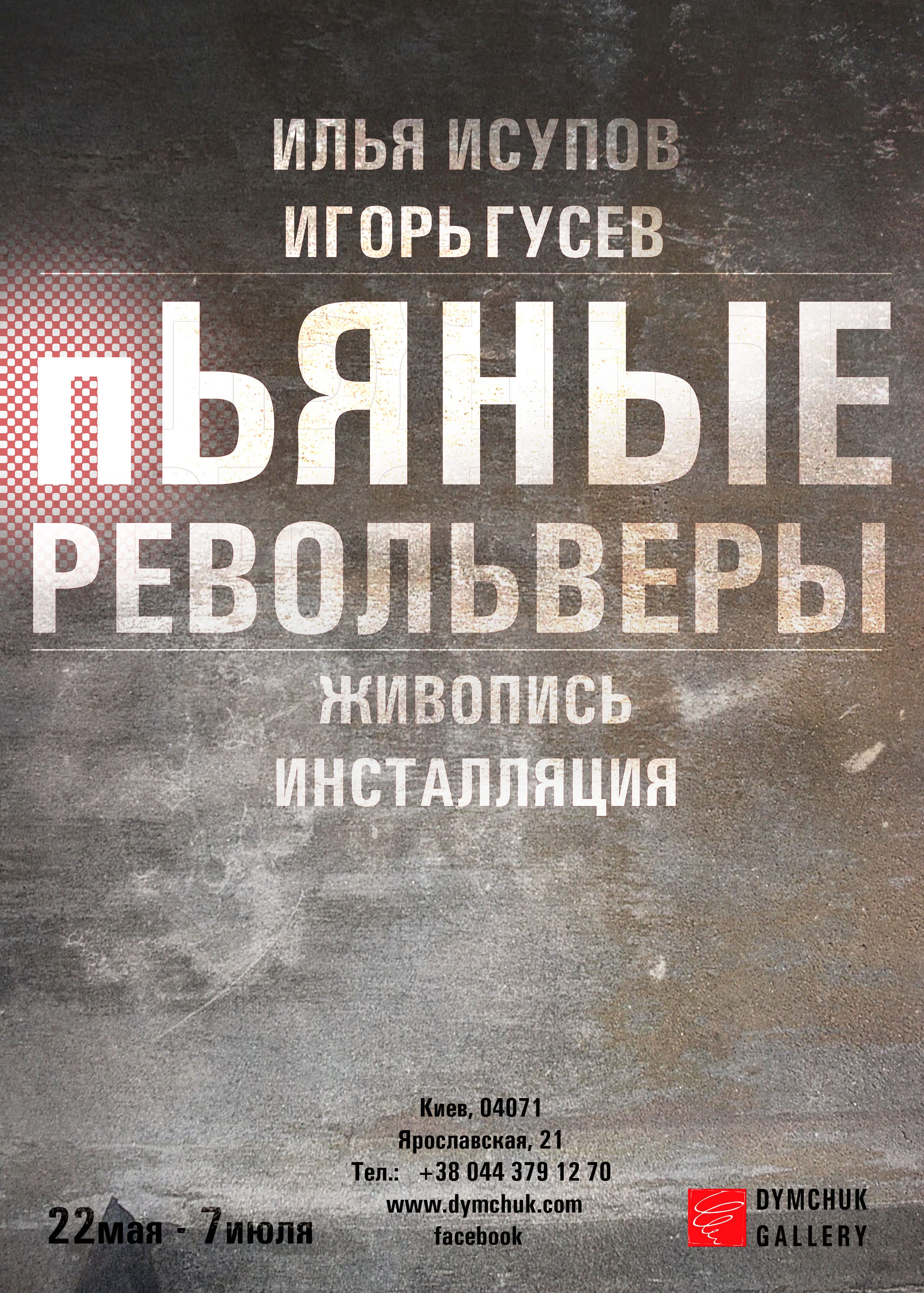22 мая в 19:00 Dymchuk Gallery приглашает на открытие совместного проекта Игоря Гусева и Ильи Исупова — художников, которые всегда рефлексируют над острыми социальными явлениями и иронично отображают их в своих работах. В проекте под названием «Пьяные револьверы» они представят живопись и инсталляции, инспирированные последними украинскими событиями. Гусев и Исупов до последнего хранят интригу и в качестве своеобразного тизера к выставке предлагают короткий манифест: