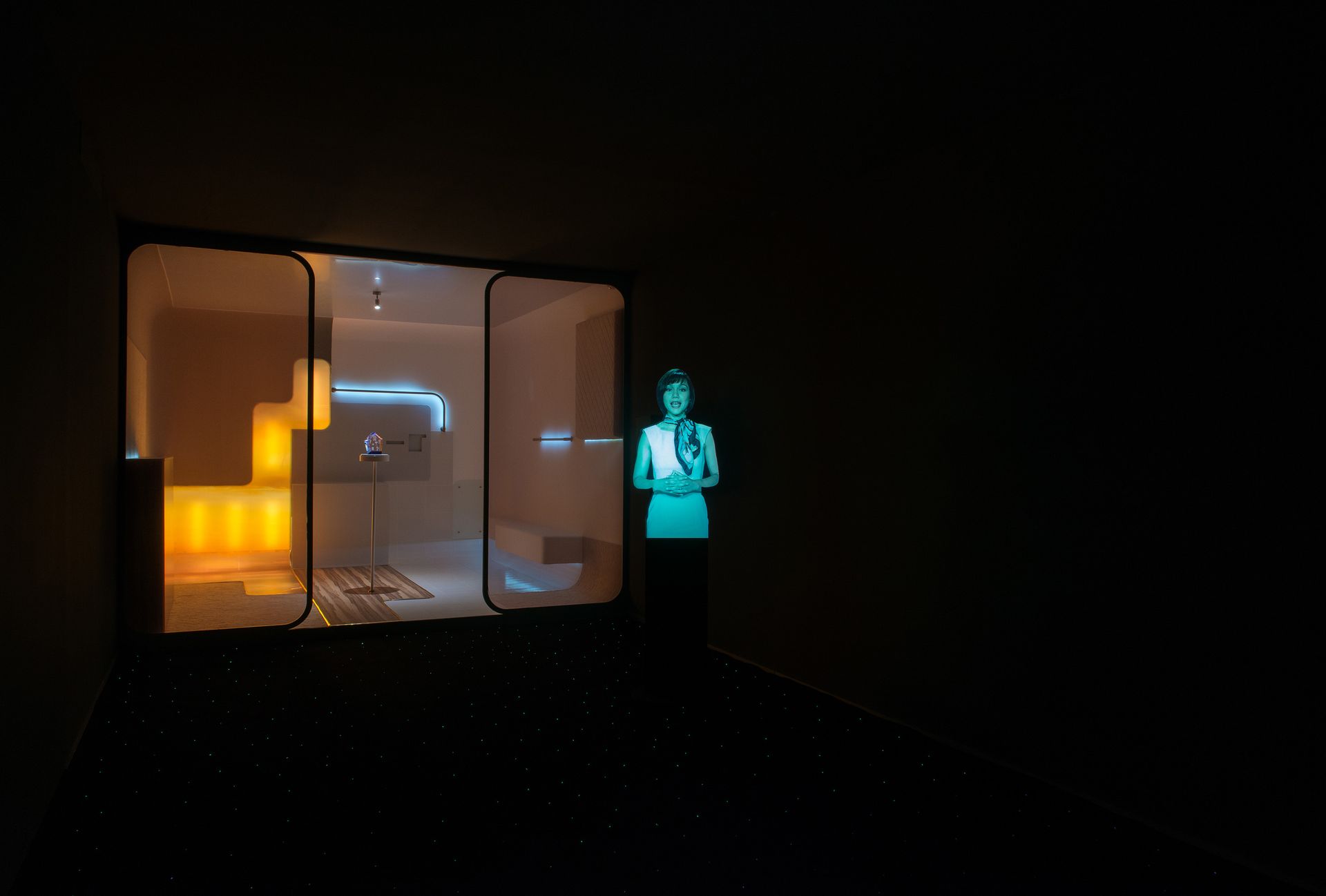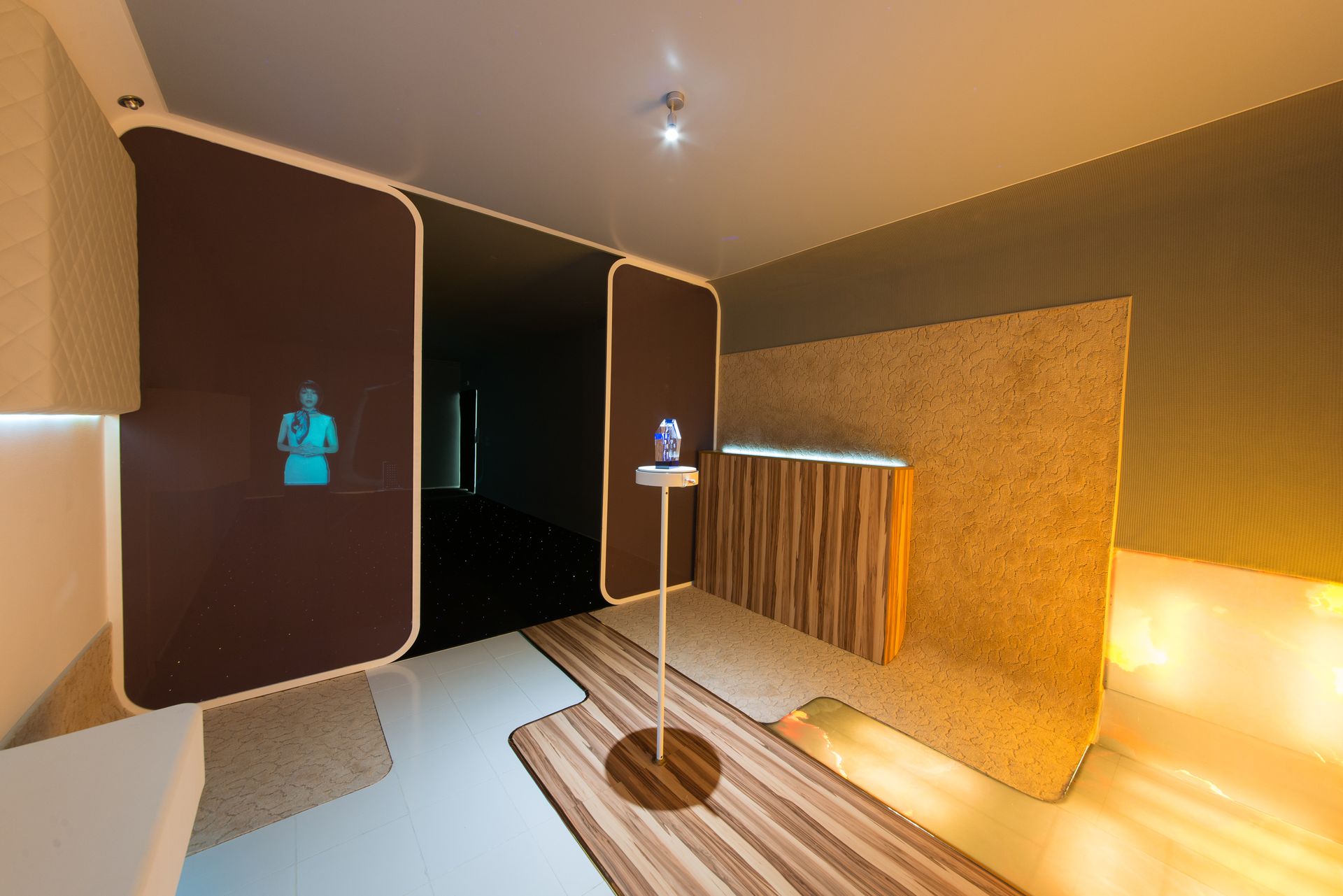 відеопроекція, динаміки, акрил, килим, LED лампи, люмінесцентні лампи, лампа для читання, волоконно-оптичне освітлення, лайкра, шпон із фанери, лак, МДФ, латунь, кристал з лазерним гравіюванням, програвач, поліестер, фарба, метал, поліровані латунні смужки, цифрове зображення, надруковане на поліестеровій прозорій плівці, керамічна плитка, шкіра, матове скло, натяжна стельова тканина