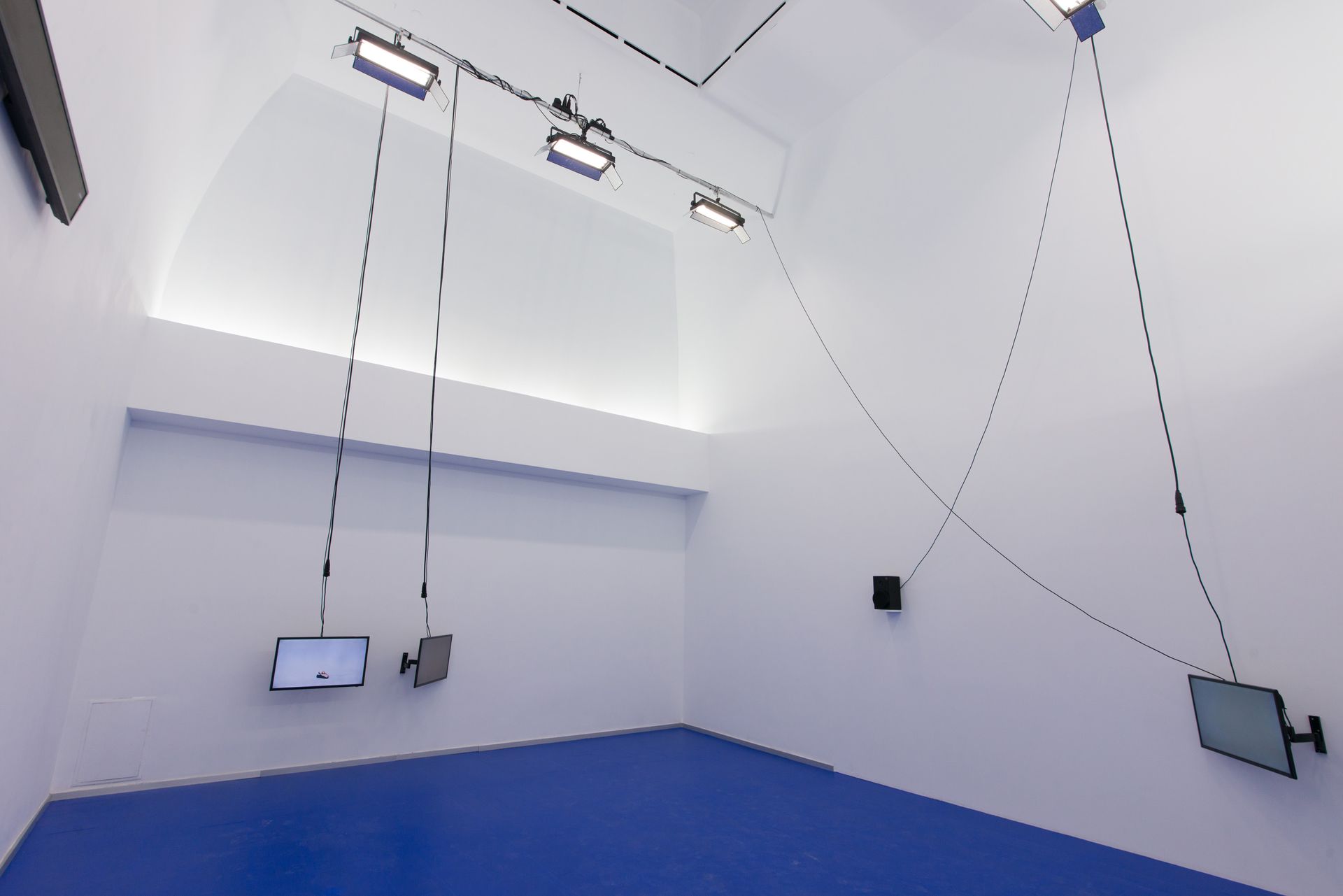 Триканальне відео, підлога телестудії хромакей синього кольору