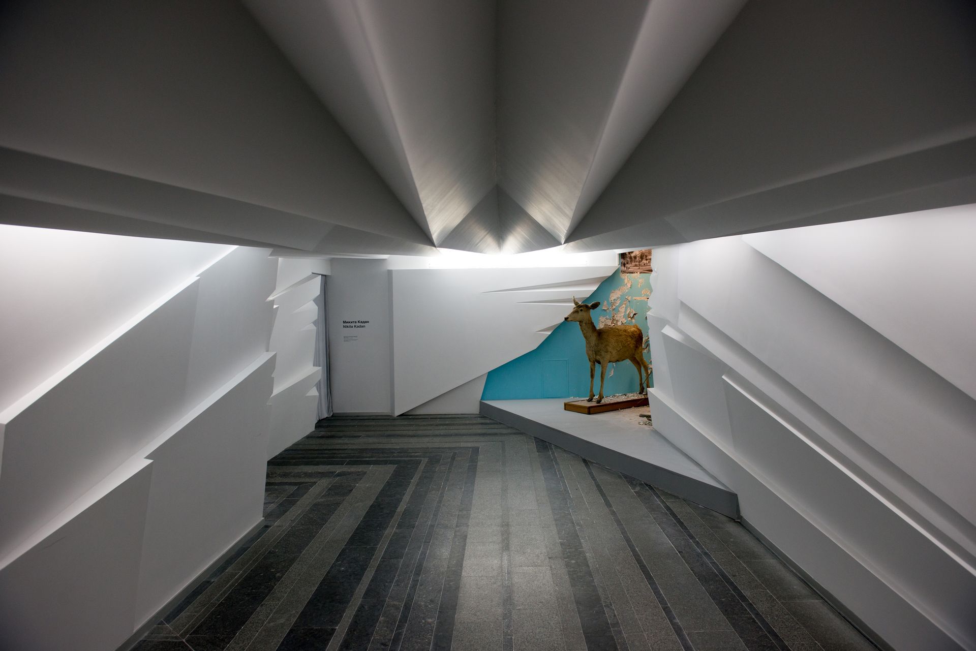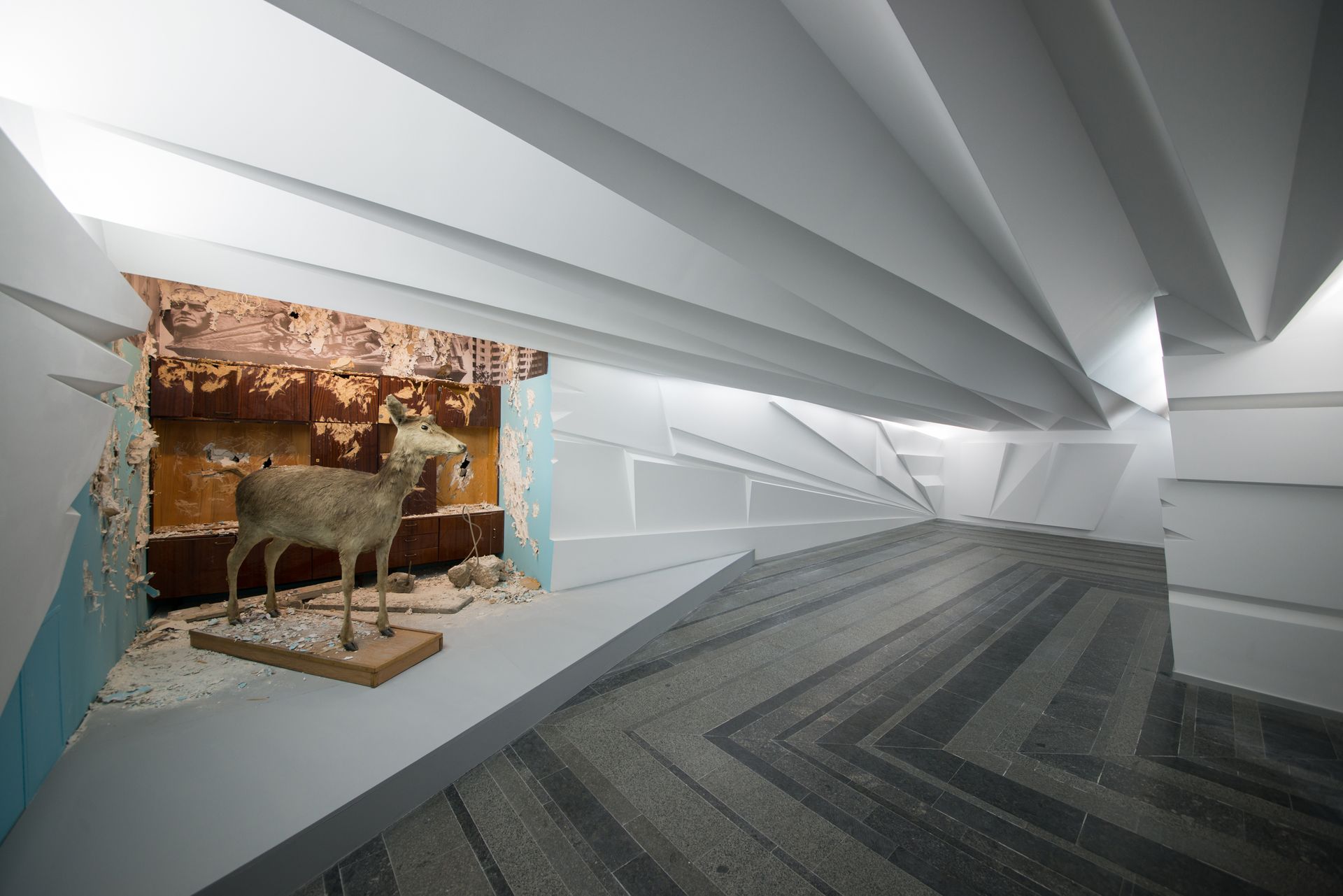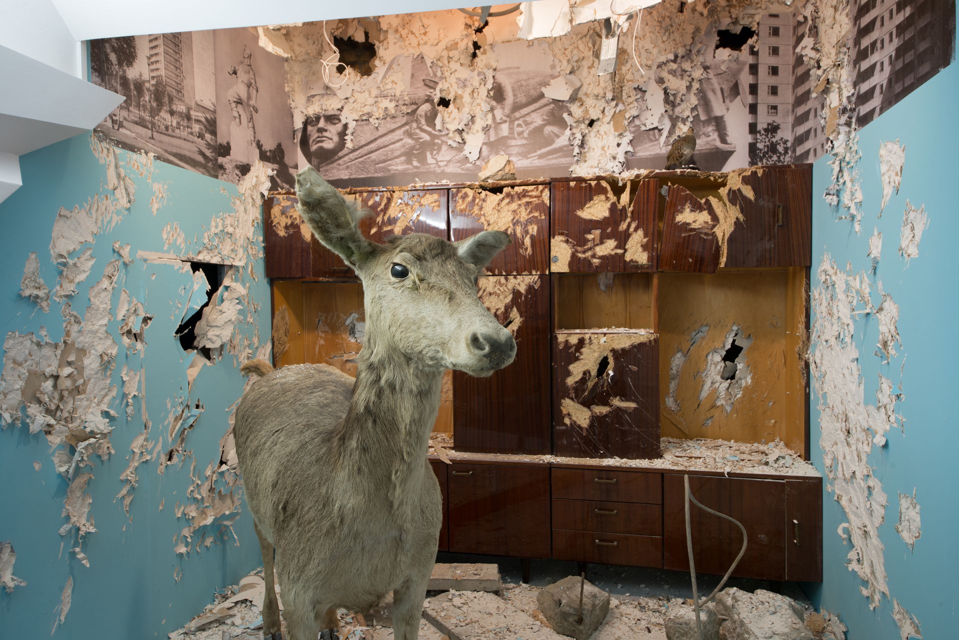 Дерево, метал, гіпс, опудало оленя, друк на папері, фарба