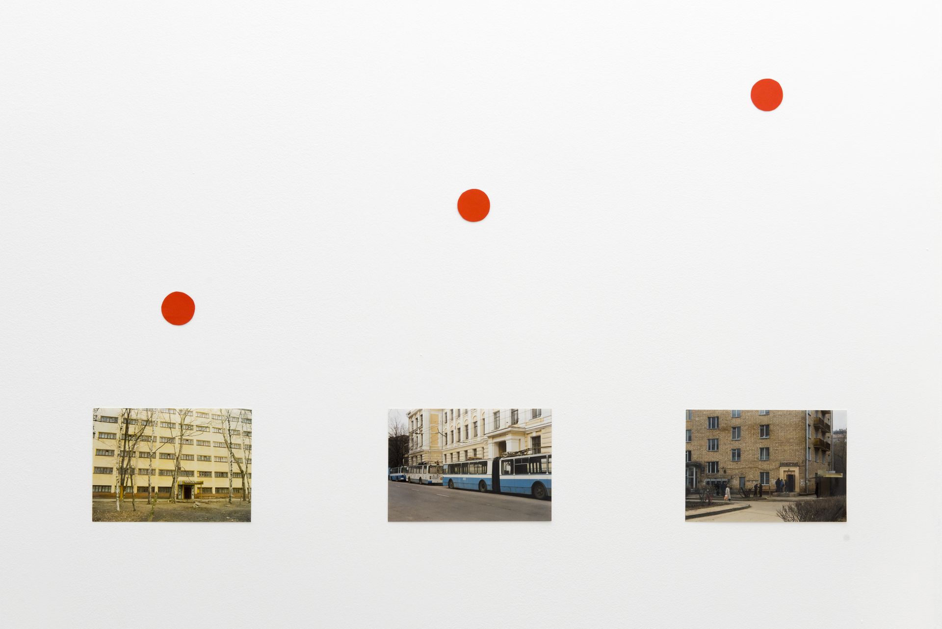 Юрій Лейдерман. «Місця, де я був щасливий», 1995 кольорові фотографії, червоні паперові кружечки