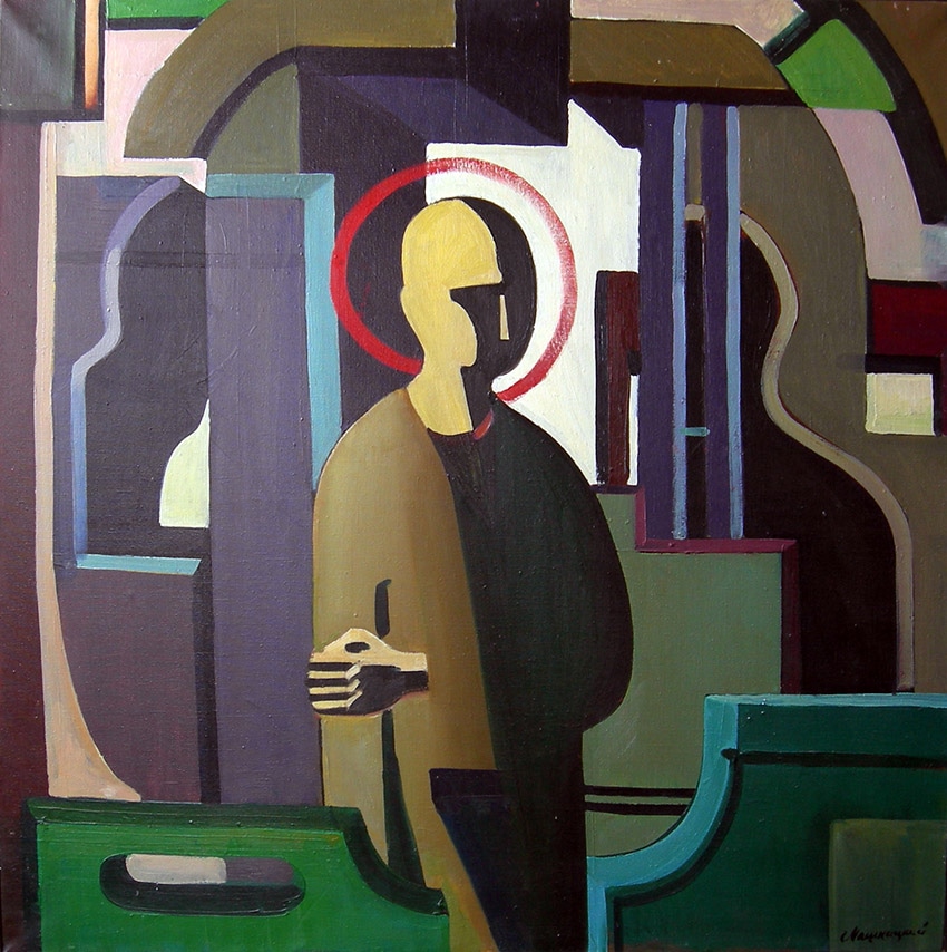 На представленій роботі фігура, розташована в центрі і зображена з червоним німбом і злегка окресленими рисами обличчя, — автопортрет художника. Обабіч його оточують людські силуети, уподібнені до архітектурних форм. Праворуч центральної фігури антропоморфний силует, який утілює образ Олега Голосія. Ліворуч центральної фігури — силует Юрія Соломка.  Силуетні зображення друзів художника зображені частинами стилізованої архітектурної перспективи і формують тло картини як утілення тогочасного кола спілкування Машницького.