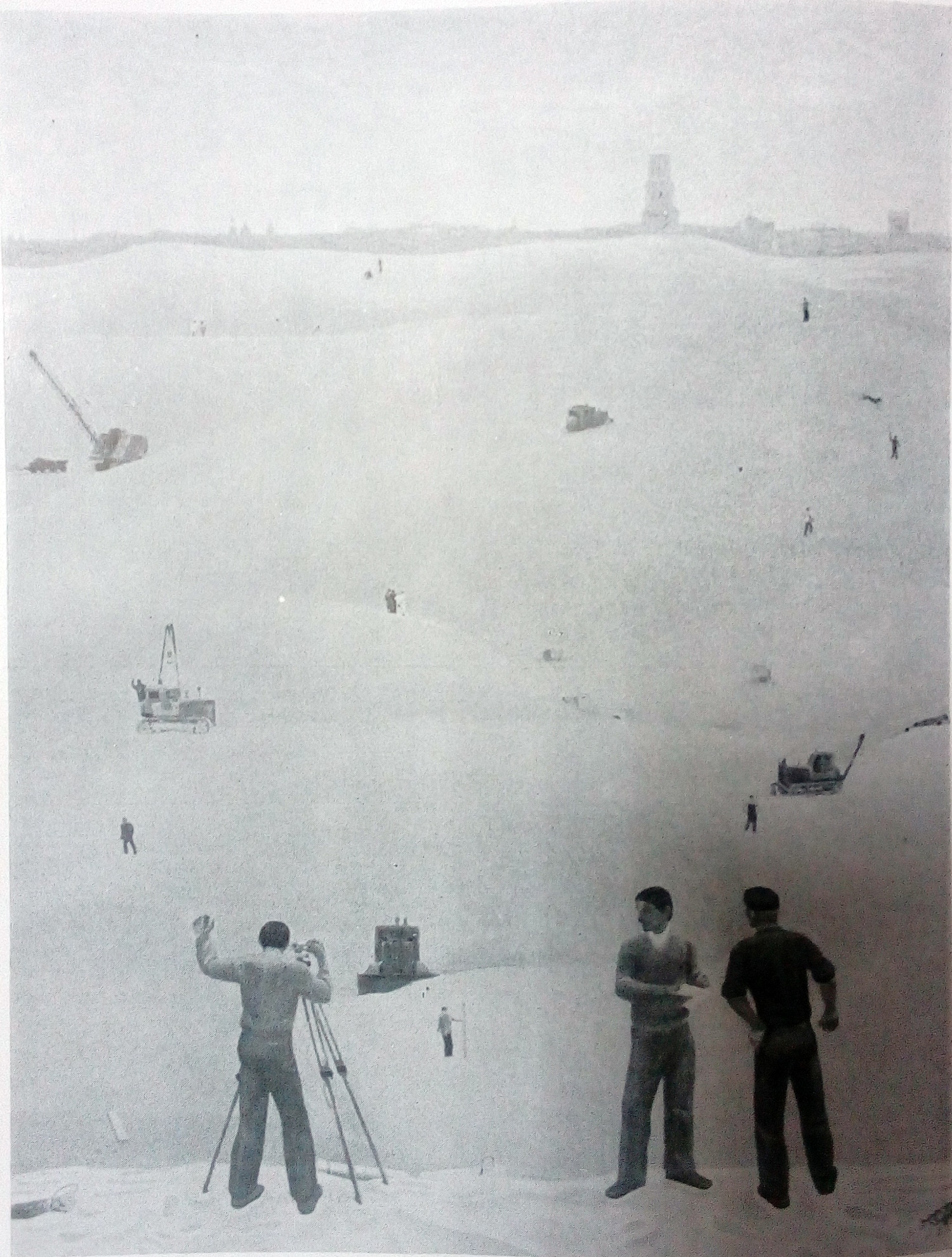 Робота «На Березняках» ілюструє будівництво нових житлових районів Києва. Більшу частину композиції займає намитий пісок, на тлі якого троє чоловіків проводять геодезичну зйомку.