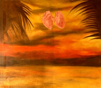 Іронічне осмислення популярних в масовій культурі образів: закохані серця, захід сонця, пальми.