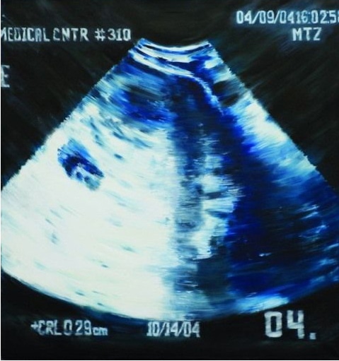 Сонографія або ультразвук — це спосіб візуалізувати внутрішню частину людського тіла за допомогою високочастотних хвиль. Саме ця технологія найчастіше використовується для обстеження плоду в утробі матері. Ця серія робіт зображує розвиток дитини (бачений ніби скрізь призму УЗД апарату) з перших днів в утробі матері і до пологів.